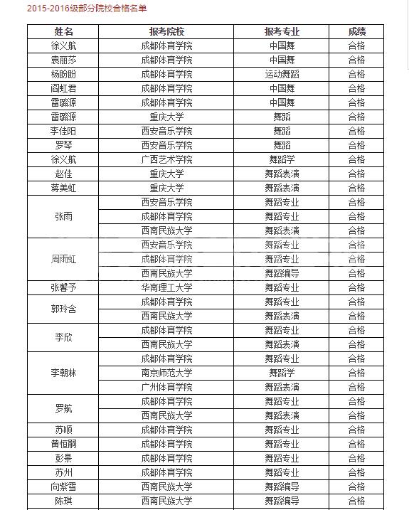 2015-2016綰ф牎鑰冿紝鑸炶箞涓撲笟鐩墠閫氳繃鎴愰兘浣撹偛瀛﹂櫌16浜恒佸箍瑗胯壓鏈闄?浜恒侀噸搴嗗ぇ瀛?浜恒佽タ瀹夐煶涔愬闄?浜恒佽タ鍗楁皯鏃忓ぇ瀛?浜?(鐢變簬綃囧箙鏈夐檺錛屼粎灞曠ず閮ㄥ垎闄㈡牎)