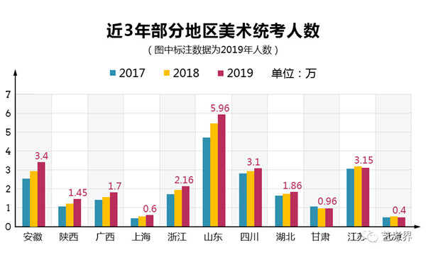 从历q的l计来看Q?a style="color:#00F;">术?/a>人数一直都占绝对主,普遍过半数Q有的地区甚臌q?0%。也是_全国全年100万左右的报考hCQ有六七十万人是术生。部分地区各艺术专业报考h数占比如下: