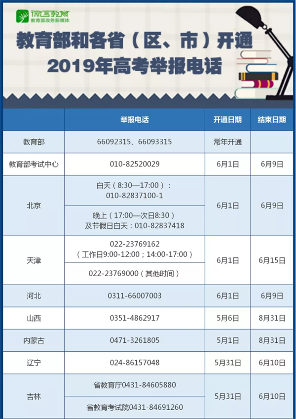 q日Q教育部l一公布了教育部以及全国31个省(区、市)教育行政部门和招生考试机构2019q的高考D报电话,Ƣ迎q大考生、家长及C会各界人士及时举报反映涉及2019q高考安全的U烦。教育部及各?区、市)会同有关部门根据D报线索第一旉核查处理Q坚决维护高考公q_正?