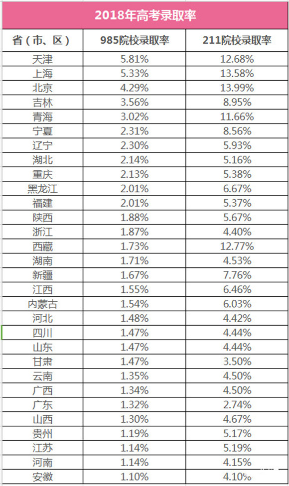 而像沛_(98.38?、广?75.8?、四?62?、山?59.2?、安?49.9?、河?48.64?、湖?45.18){地作ؓ高考大省,2018q高考中985/211的录取率低的几乎均位于倒数?