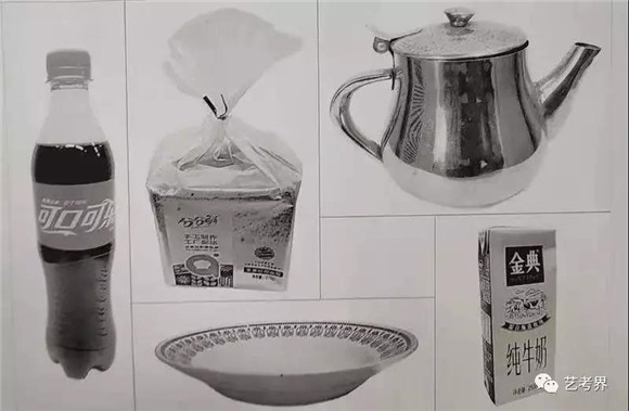 三、模拟写生内容:可乐一Ӟ塑料袋包装的面包一袋,不锈钢水壶一个,L一个,U质包装牛奶一盒?见图片小?