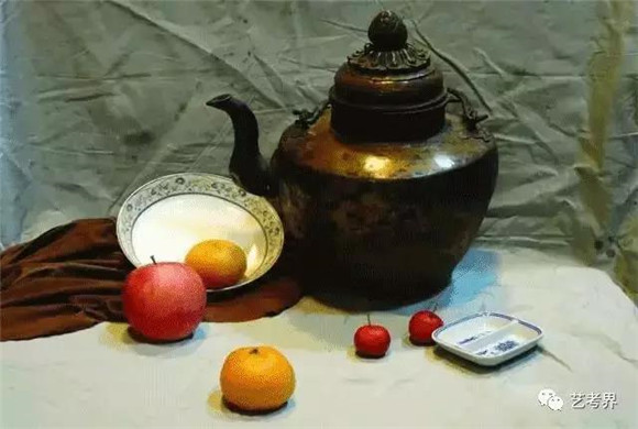 三、模拟写生内容:一个铜Ӟ一个瓷盘,一个瓷,一个苹果,两个子Q两颗山楂,一块浅色衬布,一块灰色衬布,一块深色衬布?见图片小?