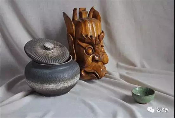 三、模拟写生内容:一个木制傩面具Q一个带盖的陶罐Q一个小陶瓷茶杯Q一块浅色衬 布?见图片小?