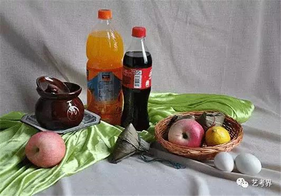 三、模拟写生内容:一瓶橙汁,一瓶可乐,一个带盖的陶罐Q一个瓷盘,一个柳~盘Q两个苹果,三个_子Q一个柠檬,两个鸭蛋Q一块绿色衬布、一块浅色衬布?见图片小?