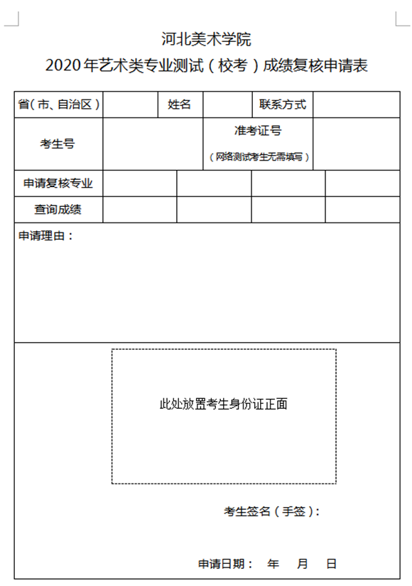 1.下蝲《河北美术学?020q艺术类专业试(校?成W复核甌表?见附Ӟ以下U《复核申误?Q严格按照要求填写,必须p生本h亲笔{q摁指模Q同旉w䆾证正面照片?/span>