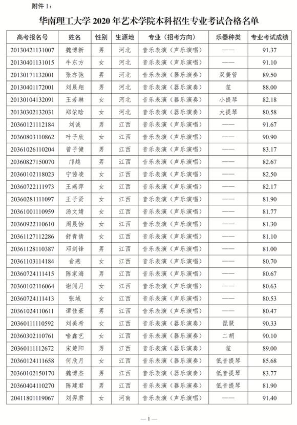 一、专业考试合格分数U和名单华南理工大学2020q艺术学院本U招生音乐学、音乐表演各招生专业(招考方?专业考试合格分数UؓQ?/strong>