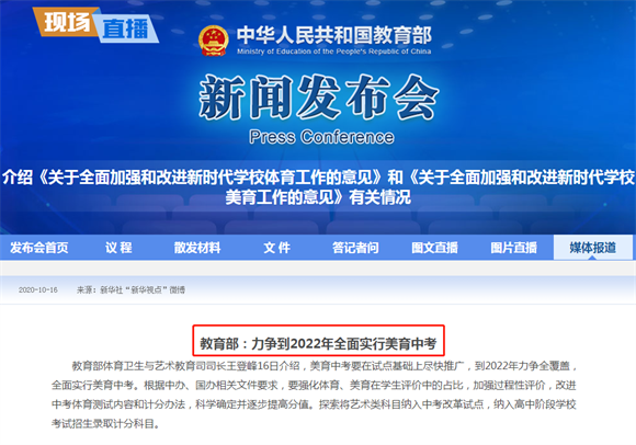 2020q?0?6日,教育部体育卫生与艺术教育司司长王d在新d布会上表C,育中考要在试点基上尽快推q,?022q力争全覆盖Q全面实行美育中考?/span>