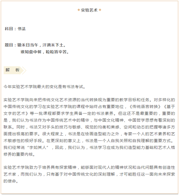 2021q央实验艺术专业的“造型能力”科目考试Q首ơ设|了书法考试。除了一张默写镜面钢球的素描Q另外一Z法考试。考题是在四尺对开的宣U怸写名诗:“锄日当午Q汗滴禾下土Q谁知盘中餐Q粒_皆辛苦”。字体风g限?/span>
