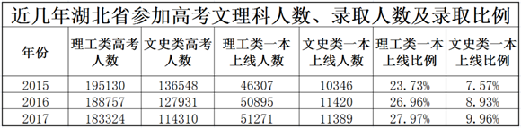 姣斿錛岄氳繃涓嬪浘鐨勬箹鍖楃渷2015騫?/span>-2017騫村弬鍔犻珮鑰冪殑鏂囩悊縐戜漢鏁板拰褰曞彇浜烘暟鍙婃瘮渚嬶紝灝卞彲浠ョ湅鍑猴紝涓婁竴鏈嚎鐨勪漢鏁扮悊縐戞瘮渚嬫槸鏂囩鐨?/span>3鍊嶅乏鍙籌紝铏界劧褰曞彇姣斾緥閮藉湪閫愬勾澧炲姞錛屼絾鐢變簬鐞嗙鐢熶漢鏁板錛屽鍔犳洿蹇紝鐞嗙澧炲姞鐨勪漢鏁拌繙澶氫簬鏂囩鐨勪漢鏁般?/span>