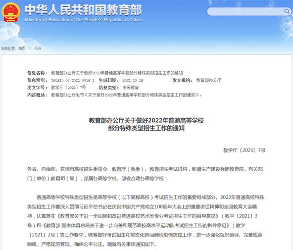 日前Q教育部办公厅发布《关于做?022q普通高{学校部分特D类型招生工作的通知》。明要求: