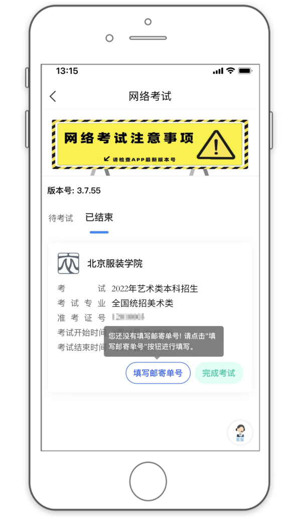 涓夈佽冪敓欏誨湪鑰冭瘯褰撳ぉ灝嗗瘎鍥炵殑閭掑崟鍙峰~鍐欏埌鑹烘湳鍗囨姤鍚嶇郴緇熶腑銆傚湪鑹烘湳鍗嘇PP涓偣鍑繪姤鑰冣啋緗戠粶鑰冭瘯鈫掑凡緇撴潫鈫掓壘鍒版湰涓撲笟鑰冭瘯錛屽湪鑰冭瘯涓嬫柟鐐瑰嚮鈥滃~鍐欓偖瀵勫崟鍙封濓紝杈撳叆閭瘎鍗曞彿鍚庣偣鍑葷‘瀹氾紝濡傛灉杈撳叆閿欒錛屽彲浠ュ啀嬈$偣鍑昏鎸夐挳錛岀劧鍚庡湪杈撳叆妗嗕腑淇敼閭瘎鍗曞彿鍗沖彲銆?/span>