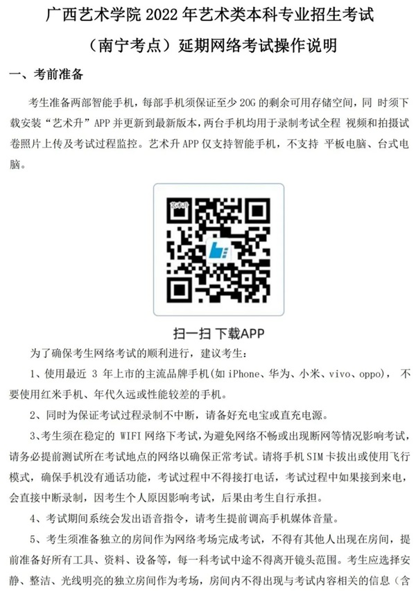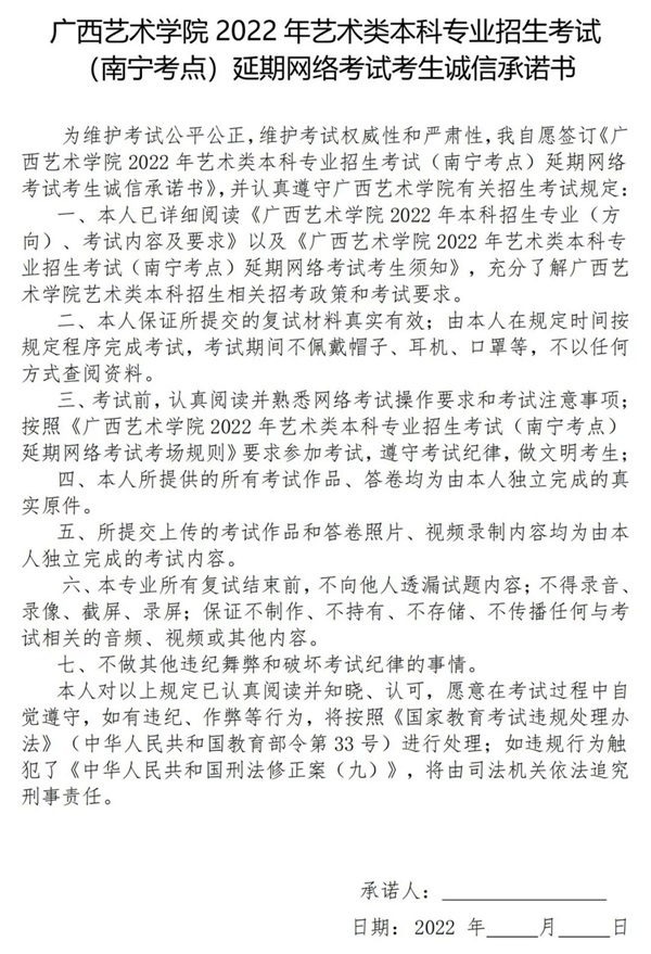 1.鑰冪敓欏昏嚜瑙夐伒瀹堝浗瀹舵暀鑲茶冭瘯鐩稿叧娉曞緥娉曡鍜岃姹傦紝涓ユ牸鎸夌収瀛︽牎鍙戝竷鐨勫璇曚笓涓氱鐩冭瘯鑼冨洿鍙婅姹傘佹搷浣滆鏄庣瓑閫氱煡瑕佹眰錛屽仛濂借冭瘯鍑嗗宸ヤ綔錛岃瘹淇″簲鑰冦傚湪鑰冭瘯鍓嶉』閫氳繃鎵嬫満APP璁ょ湡闃呰銆婂箍瑗胯壓鏈闄?022騫磋壓鏈被鏈涓撲笟鎷涚敓鑰冭瘯(鍗楀畞鑰冪偣)寤舵湡緗戠粶鑰冭瘯鑰冪敓璇氫俊鎵胯涔︺嬶紝絳懼悕紜鍚庢柟鍙弬鍔犺冭瘯銆?