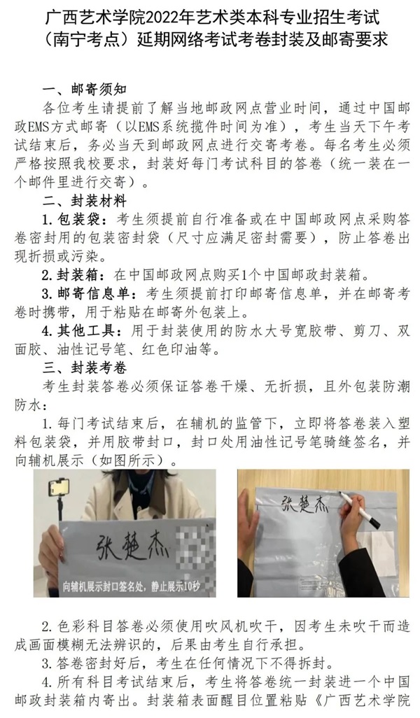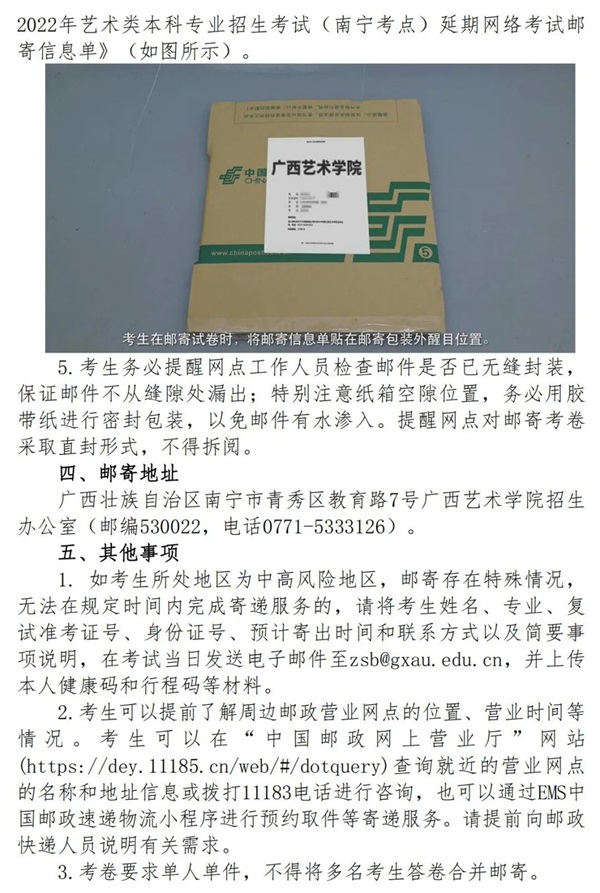 4.鑰冭瘯鐢ㄥ叿錛氳鐪熼槄璇匯?a style="color:#00F;">騫胯タ鑹烘湳瀛﹂櫌2022騫存湰縐戞嫑鐢熶笓涓?鏂瑰悜)銆佽冭瘯鍐呭鍙婅姹傘嬶紝鎻愬墠鍑嗗濂藉悇縐戠洰鑰冭瘯鐢ㄥ叿銆傛牴鎹檮浠?銆婂箍瑗胯壓鏈闄?022騫磋壓鏈被鏈涓撲笟鎷涚敓鑰冭瘯(鍗楀畞鑰冪偣)寤舵湡緗戠粶鑰冭瘯鑰冨嵎灝佽鍙婇偖瀵勮姹傘嬶紝鎻愬墠鍑嗗濂介偖瀵勫寘瑁呮潗鏂欍?