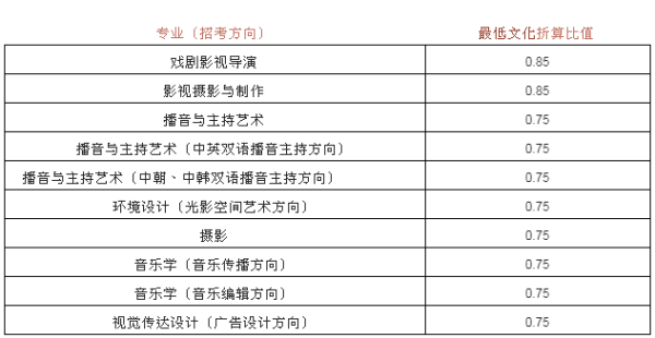戏剧p导演、媄视摄׃制作、播音与L艺术、播音与L艺术(中英 双语播音L方向)、播音与L艺术(中朝、中韩双语播音主持方?、环? 设计(光媄I间艺术方向)、摄影、音乐学(音乐传播方向)、音乐学(音乐~? 辑方?、视觉传达设?q告设计方向)10个专?方向)Q在考生文化折算比D到我校确定的本专业最低折比值情况下Q按照综合分(l合?文化折算比?专业折算比?择优录取。综合分相同Q按专业排名择优录取?