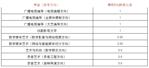 q播电视~导(电视~辑方向)、广播电视编?全媒体摄制方?、广播电视编?文艺~导方向)、戏剧媄视文学、数字媒体艺?数字影像与网l视 频方?、数字媒体艺?|络与智能媒体设计方?、艺术与U技(数字׃ 方向)、录韌?录音工程方向)、录韌?韛_导演方向)9个专?? ?Q在考生文化折算比D到我校确定的本专业最低折比值情况下Q按文化?比值择优录取。文化比值相同,按专业排名择优录取?