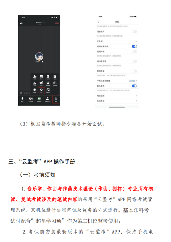 1.音乐学、作曲与作曲技术理?作曲、指挥、视q?专业所有初试、复试考试涉及的笔试内容均采用“云监考”APP|络考试理pȝQ双Zq行q程W试及监考的方式q行。参加笔试科目考试Q考生M?部智能手机,1部用于正前方获取试题和正前方实时监考,1部用于侧后方q行辅助监考ƈ答h照上传?