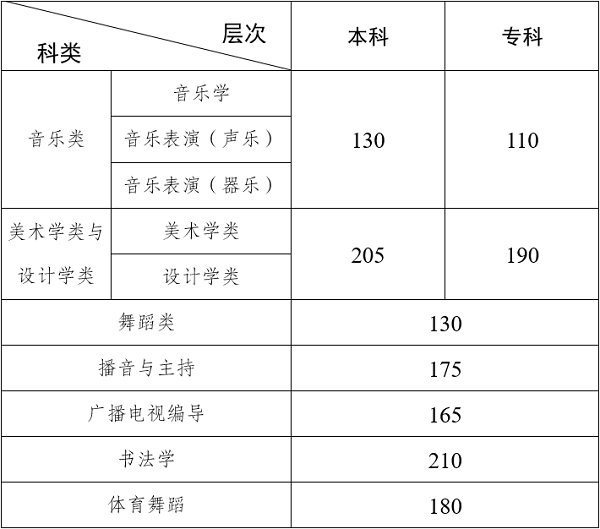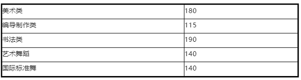 鑹烘湳綾婚珮鑱岄珮涓撴壒鏂囧寲鍒嗘暟綰匡細鑹烘湳鐞嗙被126鍒嗭紝鑹烘湳鏂囩被126鍒?鑹烘湳緇熻冨垎鏁扮嚎錛氱編鏈被180鍒嗭紝涔︽硶綾?55鍒嗭紝闊充箰綾?85鍒嗭紝鑸炶箞綾?75鍒嗭紝鎾煶涓繪寔綾?25鍒嗭紝騫挎挱褰辮緙栧綾?15鍒嗭紝鑸┖鏈嶅姟綾?15鍒嗐?
