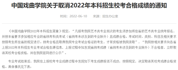 浠婂勾涓浗鎴忔洸瀛﹂櫌鍙堝彂甯冧簡銆婂叧浜庡彇娑?022騫存湰縐戞嫑鐢熸牎鑰冨悎鏍兼垚緇╃殑閫氱煡銆嬶紝鍙堟湁9浣嶈冪敓鏈弬鍔犵渷緇熻冩垨鐪佺粺鑰冧笓涓氭垚緇╀笉鍚堟牸錛屼笉絎﹀悎瀛︽牎鐨勫綍鍙栬姹傦紝鍙栨秷浜嗕粬浠殑鏍¤冨悎鏍兼垚緇┿?/span>