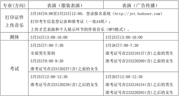 10.褰綋瑙傚療嫻嬭瘯鍚庯紝琛ㄦ紨(騫垮憡浼犳挱)涓撲笟鑰冪敓搴旇繀閫熷埌鍚庡彴鏇存崲鏈嶈榪涜闀滃墠灞曠ず嫻嬭瘯(濂崇敓欏繪洿鎹㈤珮璺熼瀷)銆傚湪姝ょ幆鑺備腑錛岃冪敓鎸夌収鍙風墝欏哄簭閫愪釜鐧誨彴錛屾牴鎹冭瘎緇勬彁渚涚殑闊充箰浠ュ満鍦頒腑璁劇疆鐨勯珮銆佷腑銆佷綆緇勫悎閬撳叿涓烘敮鐐硅繘琛屾憜濮垮娍灞曠ず銆備釜浜哄睍紺虹幆鑺備腑錛岃冪敓欏昏劚紼胯繘琛屽彴璇嶅睍紺?鐒跺悗榪涜鑸炶箞鎴栧艦浣撳睍紺猴紝鑰冨姟浜哄憳鎸夌収鑰冪敓涓婁氦鐨勪即濂忛煶涔愭挱鏀撅紝涓嶆彁渚涚幇鍦烘彁浜や即濂忛煶涔愶紝鏃犱即濂忛煶涔愯冪敓搴斾簨鍏堝悜鑰冨姟浜哄憳澹版槑;涔嬪悗欏昏繘琛屽彛璇曪紝鎸夌収闅忔満鎶藉彇鐨勯鐩洖絳旈棶棰橈紝鑰冪敓濡傛湁涓撲笟姣旇禌鑾峰鍜屾紨鍑恒佹媿鐓у疄璺電粡鍘嗭紝鍙湪姝ょ幆鑺傚悜璇勫綆瑕佷粙緇嶏紝鑰冪敓濡傛湁璧勬枡鍙甫涓婂満錛屼絾鍐呭涓嶅緱娑夊強鑰冪敓涓漢淇℃伅(濡傚鍚嶏紝鏇懼弬鍔犲煿璁満鏋勭瓑)銆傝冪敓濡傛湁鑳戒綋鐜拌嚜宸辯壒鑹蹭笌鑳藉姏鐨勫叾瀹冩墠鑹?濡傚櫒涔愩?a style="color:#00F;">澹頒箰絳?鍧囧彲鍑嗗錛岃瘎濮旀牴鎹冨療闇瑕佸姞璇曘傚懡棰樿〃婕旂幆鑺備腑錛岃冪敓鍏ㄩ儴鐣欎笅閲嶆柊緇勫悎錛?鑷?0浜轟竴緇勫弬鍔犲懡棰橀泦浣撹〃婕斻傞殢鏈烘娊棰樺悗錛岀粡榪?鑷?0鍒嗛挓鐨勫噯澶囨椂闂村紑濮嬭〃婕斻傞泦浣撹〃婕旇繃紼嬩腑錛岃冪敓涓嶈兘閫忛湶涓漢淇℃伅錛屼笉鍙嚜甯﹀叾瀹冨ぇ鍨嬮亾鍏鳳紝姣忕粍鑰冪敓鑰冭瘯鏃墮暱涓嶈秴榪?0鍒嗛挓銆?
