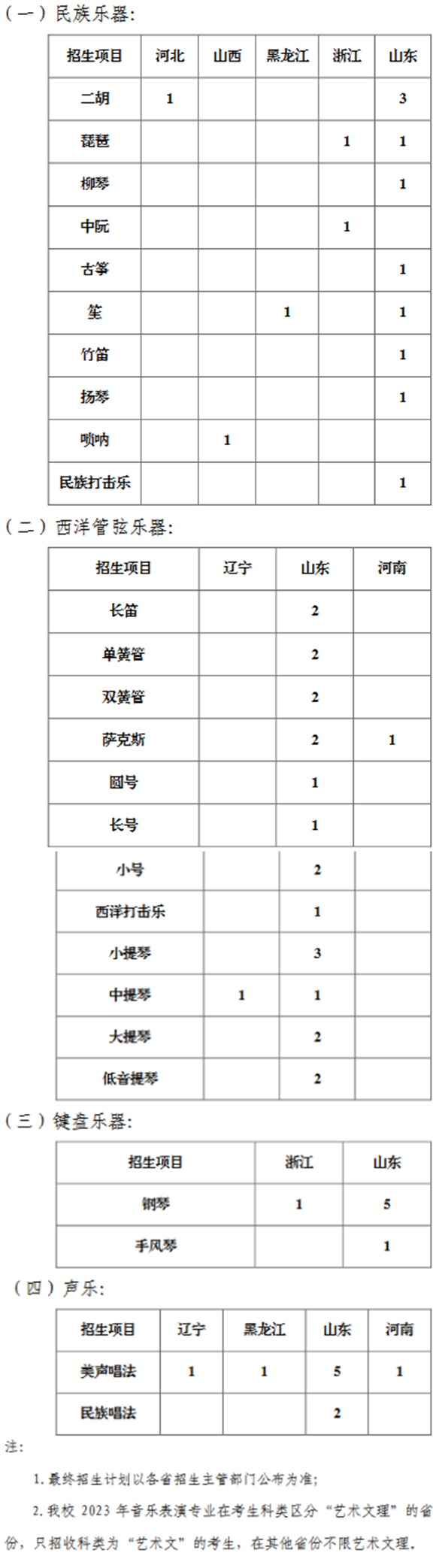 附:2023q艺术类音乐表演专业分省分专业项目招生计划表