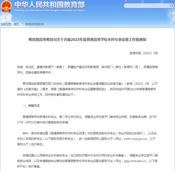 2023騫?鏈?4鏃ワ紝銆婃暀鑲查儴楂樼瓑鏁欒偛鍙稿叧浜庡紑灞?023騫村害鏅氶珮絳夊鏍℃湰縐戜笓涓氳緗伐浣滅殑閫氱煡銆?鏁欓珮鍙稿嚱銆?023銆?鍙?鍙戝竷錛屾媺寮浜?023騫存櫘閫氶珮鏍℃柊澧炪佹挙閿銆佽皟鏁存湰縐戜笓涓氱殑搴忓箷銆?/span>