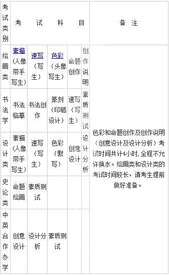 5、考试旉Q素描、色彩:3时;速写Q?5分钟;命题创作及说?创意设计及分?Q?时;中英合作办学创意设计及分析:2时;书法临摹Q?时45分钟;书法创作Q?时;刻(印稿设计)Q?时;命题l画Q?时;素质试Q?5分钟?