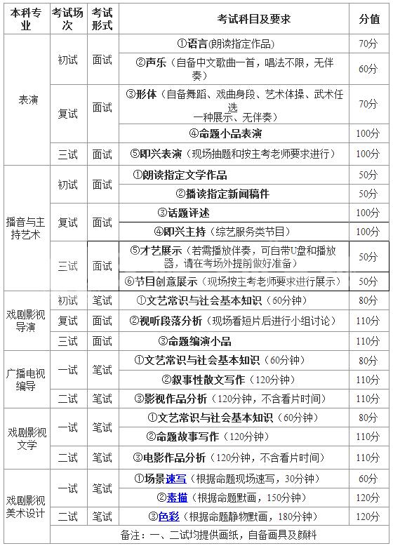 澶囨敞錛氳〃婕斾笓涓氥佹挱闊充笌涓繪寔鑹烘湳涓撲笟銆佹垙鍓у獎瑙嗗婕斾笓涓氱殑鑰冭瘯鏃ユ湡鍚垵濮嬨佸璇曞拰涓夎瘯銆傚叿浣撹冭瘯鏃墮棿璇峰叧娉ㄨ冪偣鐜板満鍏竷鐨勮冭瘯嫻佺▼瀹夋帓銆?