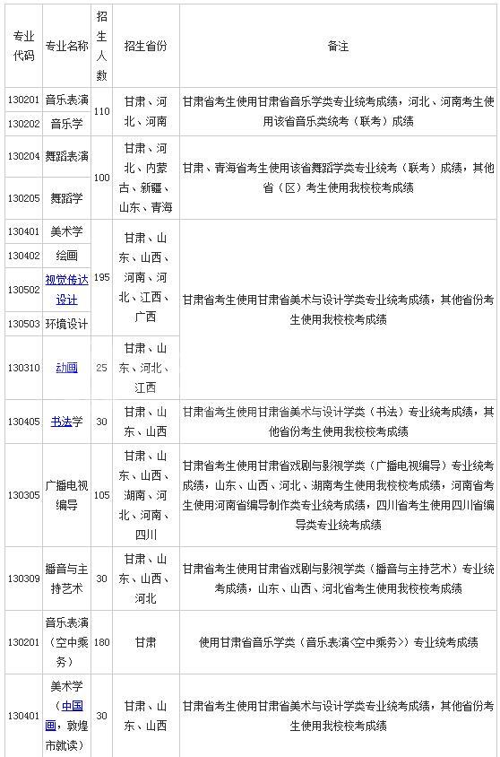 2、美术学、绘甅R视觉传达设计、环境设计在甘肃省按术学类(含美术学、绘?、设计学c?含视觉传达设计、环境设?招生Q外省按术学类(含美术学、绘甅R视觉传达设计、环境设?招生Q音乐表演、音乐学按照音乐表演(含音乐表演、音乐学)招生Q舞y表演、舞y学按舞y表?含舞y表演、舞y学)招生Q新生报到进校后按照相应学院公布的专业分方案确定最l专业?