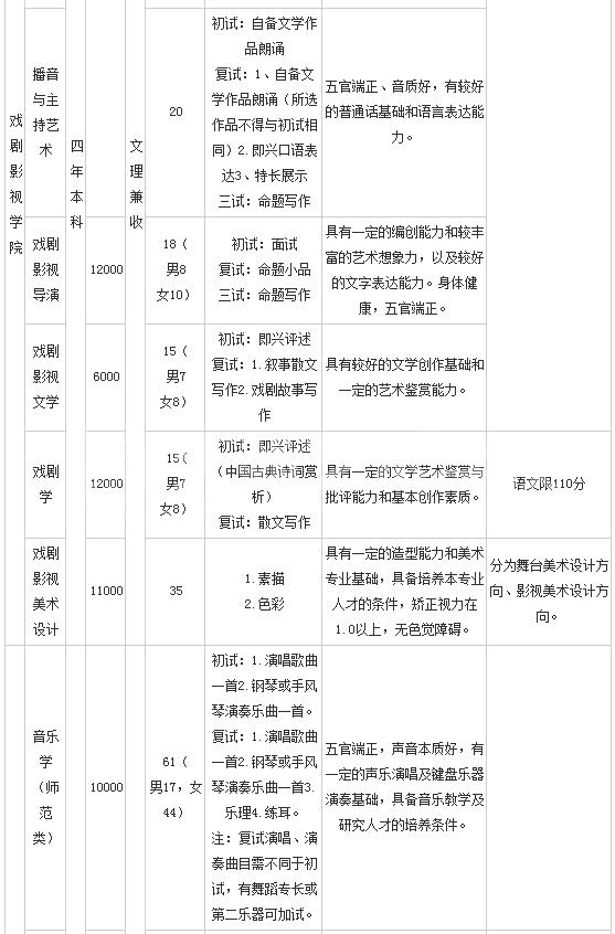 2.鎬у埆瑕佹眰錛氭垜闄㈣〃婕斻佹垙鍓у獎瑙嗗婕斻佹垙鍓у獎瑙嗘枃瀛︺佹垙鍓у銆侀煶涔愬(甯堣寖綾?銆佽垶韞堣〃婕斻佽〃婕?鏃惰妯$壒琛ㄦ紨)涓撲笟鏈夌敺濂蟲瘮渚嬭姹?鎴忓墽褰辮緹庢湳璁捐(鍖栧緹庡璁捐)(涓鍚堜綔鍔炲)鏈涓撲笟銆佷漢鐗╁艦璞¤璁′笓縐戜笓涓氬彧鎷涙敹濂崇敓;鍏朵粬涓撲笟鏃犵敺濂蟲瘮渚嬭姹傘?