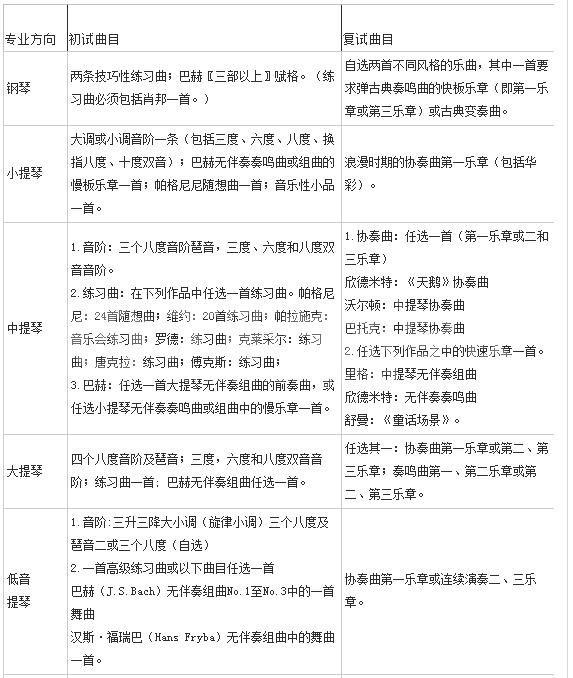 注:所有演??专业曲目均须背谱。报考小提琴专业的考生可以兼报中提琴?