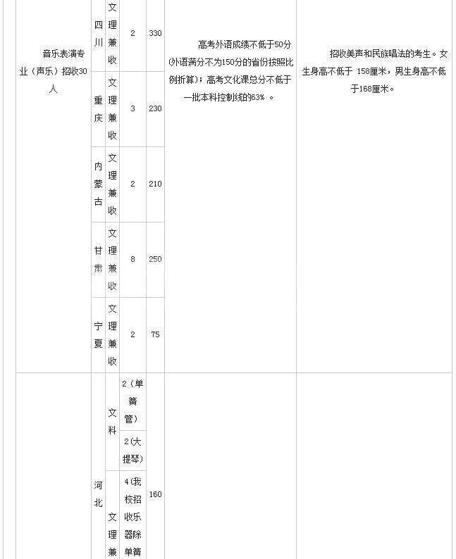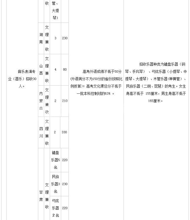 音乐表演专业Q?0名。其中声?0?包含声唱法和民族唱?;器乐30名,乐器U类包含键盘乐器(钢琴、手风琴)、弓弦乐?提琴、中提琴、大提琴)、木乐?单簧?、民族乐?二胡、琵??