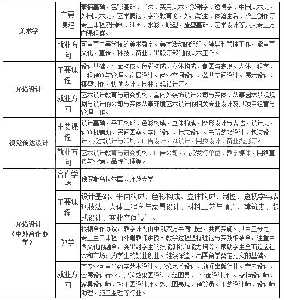 瀛﹂櫌鐜版湁涓変釜鏈涓撲笟(鍚竴涓柟鍚?錛屽嵆緹庢湳瀛︺佺幆澧冭璁°佽瑙変紶杈捐璁★紝鍏朵腑鐜璁捐鍚腑澶栧悎浣滃姙瀛︽柟鍚戙傜編鏈涓撲笟榪涗竴姝ョ粏鍖栧洓涓笓涓氬煿鍏繪柟鍚戯紝鍗充腑鍥界敾銆佹補鐢匯佹按褰┿侀洉濉戙傜幇鏈変笓浠繪暀甯?0浜猴紝鍏朵腑鏁欐巿3浜猴紝鍓暀鎺?浜猴紝澶氭暟鏁欏笀鏇懼厛鍚庤繘淇簬鏁欒偛閮ㄦ暀甯堢爺淇彮銆佷腑澶編闄€佷腑鍥界編闄€侀瞾榪呯編闄㈢瓑涓撲笟緹庢湳闄㈡牎銆傚闄㈢幇鏈変笓涓氱敾瀹ゃ佸疄楠屽銆佸伐浣滃銆佸簱鎴跨瓑30浣欓棿錛屾婚潰縐?000澶氬鉤鏂圭背錛岀粍寤轟簡鏉愭枡宸ヤ綔瀹ゃ佸彜鐢諱慨澶嶄笌瑁呰1宸ヤ綔瀹ゃ佸井闆曡璁′笌鍒朵綔宸ヤ綔瀹わ紝瀹炶返鏁欏鍩哄湴閬嶅竷鍚夋灄銆佽窘瀹併佸畨寰姐佹渤鍖楃瓑鍦般傝繎涓夊勾灝變笟鐜囪揪90%浠ヤ笂銆?