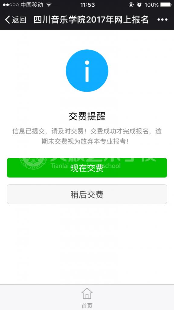 考生在报名交费过E中Q请核对交费信息中的收款单位名称(四川音乐学院)、支付金额、报考专业等信息是否正确。交Ҏ功后所交费用一律不予退q。考点报名旉截止时仍未交费的报考信息无效?