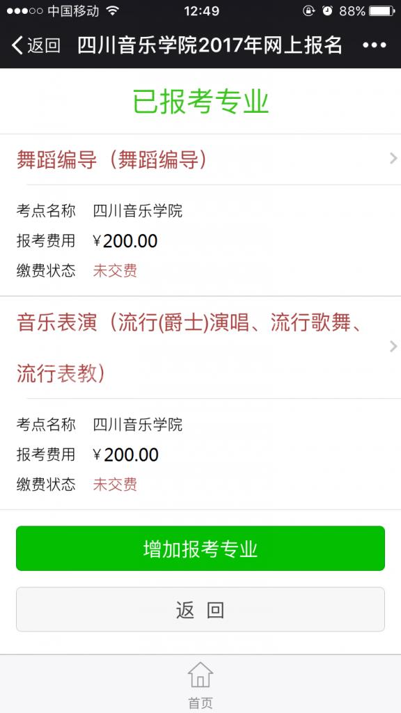 点击【稍后交贏V。蟩转到已报考专业页面,考生可点凅R增加报考专业】l报考其它专业,也可点击已报考专业,查看考试相关信息Qƈ交费?