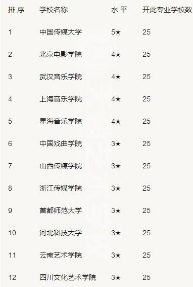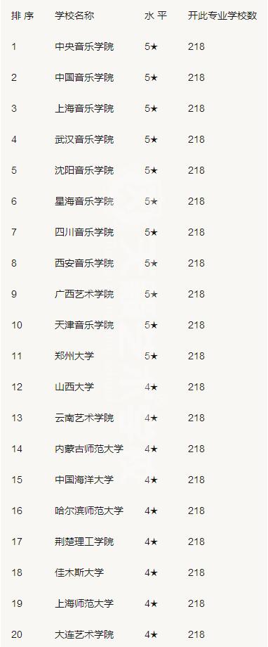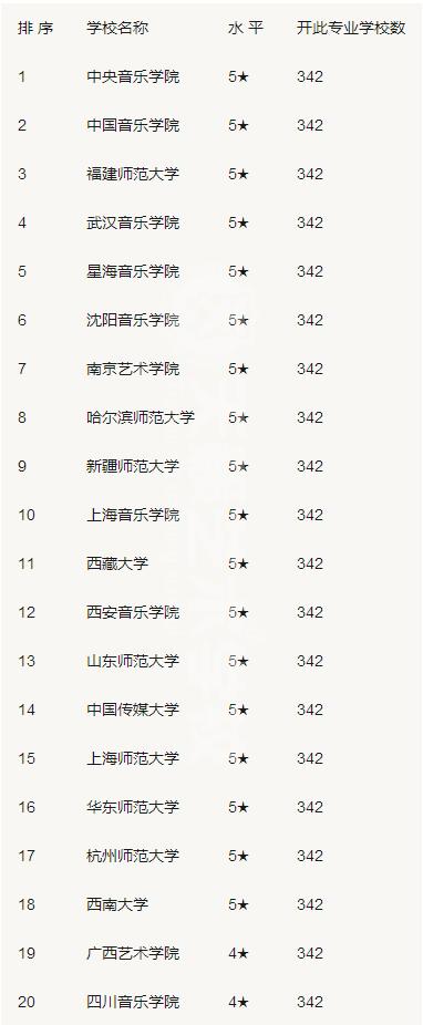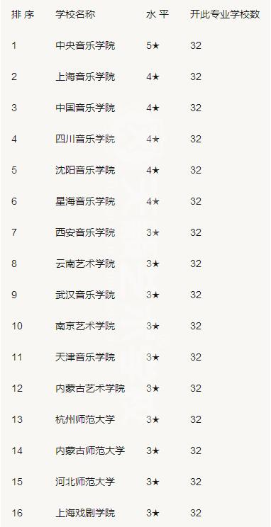 ?016q中国大学及学科专业评h报告》,发布了中国大学本U专业排行榜。其中包括音乐本U大学排名。音乐专业分为音乐学Q音乐表演,作曲与作曲技术理论,录音艺术四类专业。我们往下来看一下音乐专业大学排名情况吧!