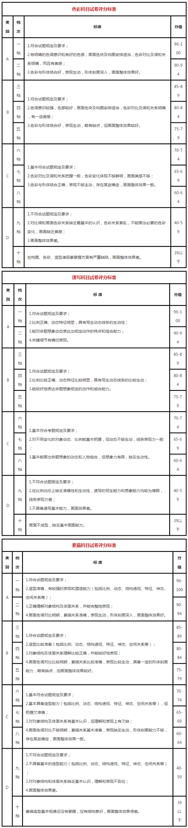 术阅卷中,评委Ҏ评分l则Q首先确定考生{卷质量的“类别”等U,然后在各{中分别确定出{卷质量的“档ơ”,最后按“ơ”对应的分数区别评委独立l分Q取每位评委分数的^均g生的最l得分。以下是往q美术联考评分标准,虽然考题每年都有“套路和反套路”,但是评分标准q不会变化?