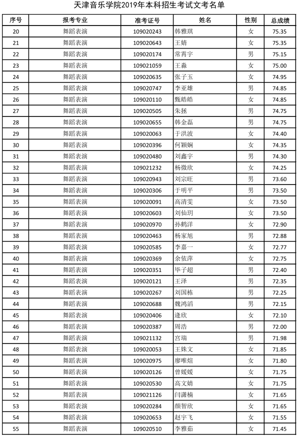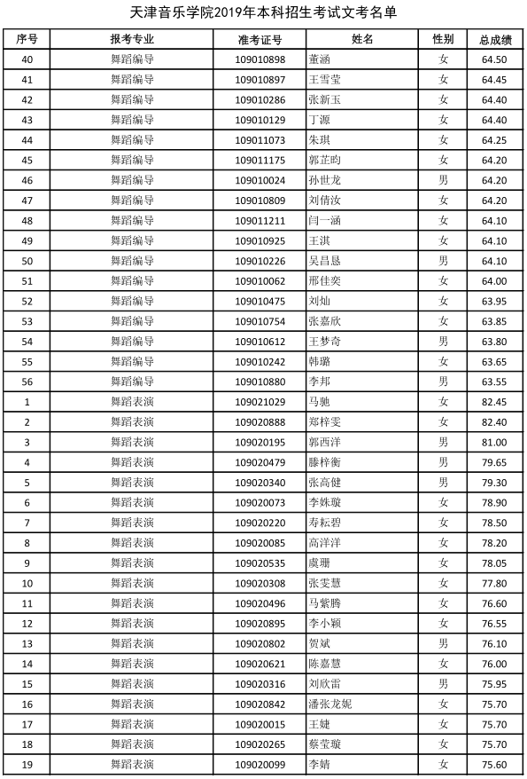 天|音乐学院2019q不单独发布校考合格线Q但可以在校考合格名单中看出排名最后一位合D生的具体成l?