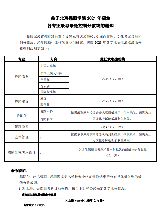 北京舞蹈学院2021q招生各专业录取最低控制分数线